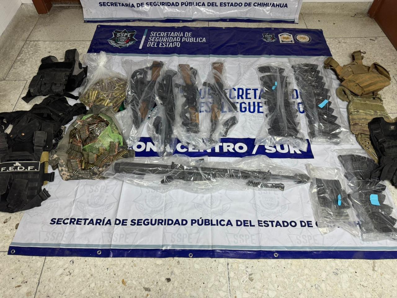 De manera paralela, los elementos realizaron un recorrido en la zona, lo que permitió localizar diversas armas largas, así como artículos presuntamente utilizados por criminales. Dentro de lo incautado se encuentra: