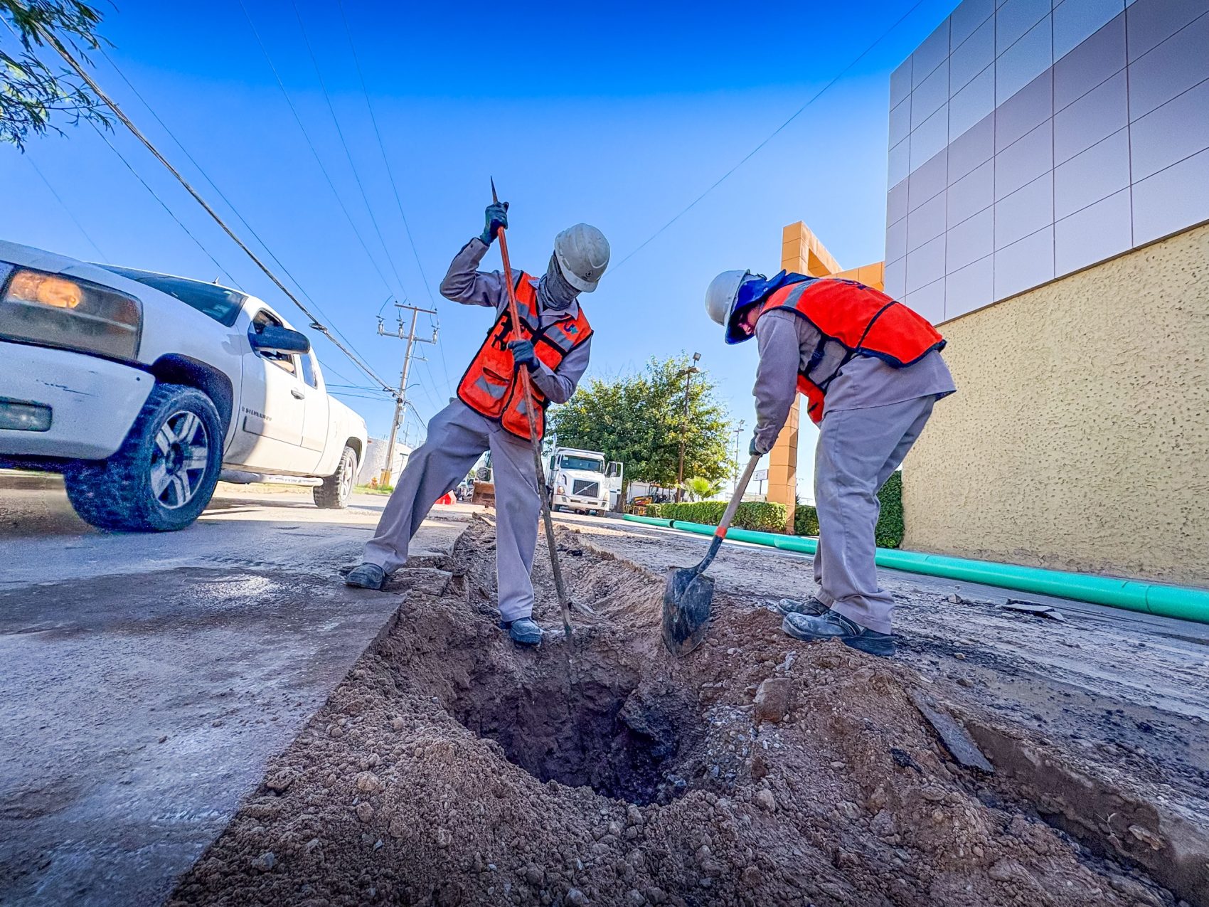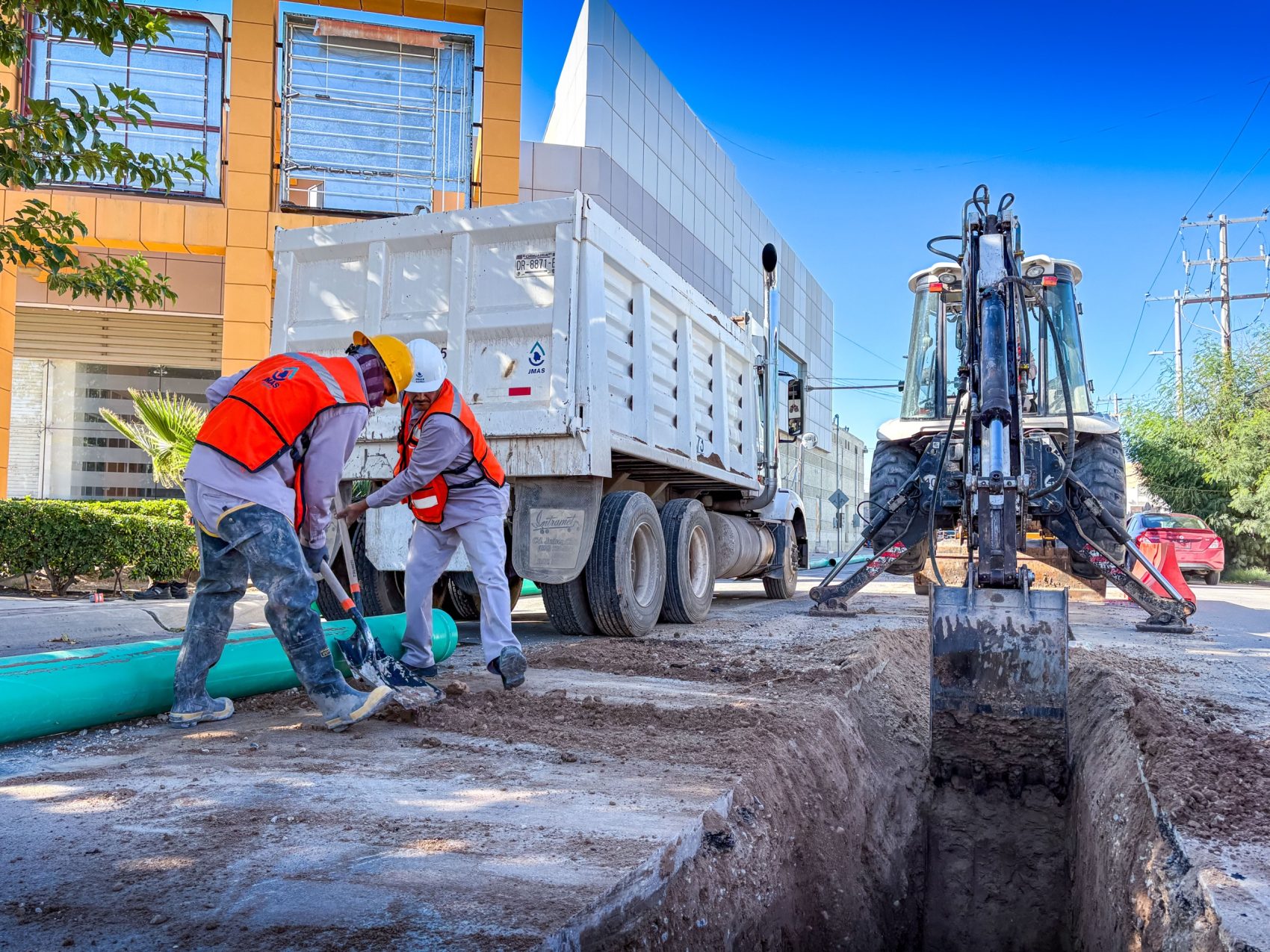 La Junta de Agua y Saneamiento de Juárez (J+) realizó la reparación de un tramo de la red de drenaje sanitario, la cual ocasionó un hundimiento expuesto en la calle Camperos, justo entre el bulevar Manuel Gómez Morín y la calle Pedro Rosales de León, donde varias cuadrillas realizaron la reposición de la tubería para normalizar el servicio y reabrir la calle a la circulación vial.