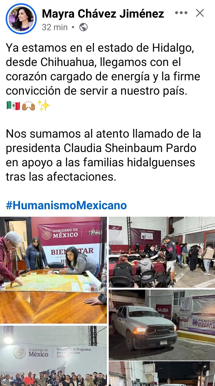 “Ya estamos en el estado de Hidalgo, desde Chihuahua, llegamos con el corazón cargado de energía y la firme convicción de servir a nuestro país. Nos sumamos al atento llamado de la presidenta Claudia Sheinbaum Pardo en apoyo a las familias hidalguenses tras las afectaciones”, escribió.