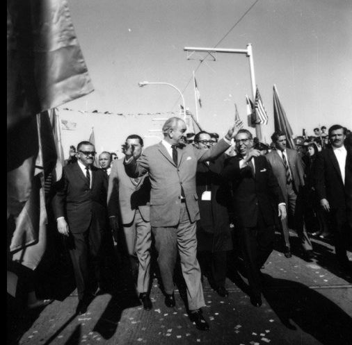Ese día, gritos de júbilo, vivas y banderas de México y Estados Unidos recibieron Adolfo López Mateos vestido de negro y a Lyndon B. Johnson con traje azul marino y sombrero tejano, en el patio de la escuela Bowie.
