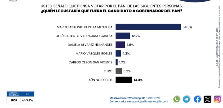 Así lo muestran los resultados del ejercicio más reciente de la casa encuestadora Massive Caller dado a conocer este día.