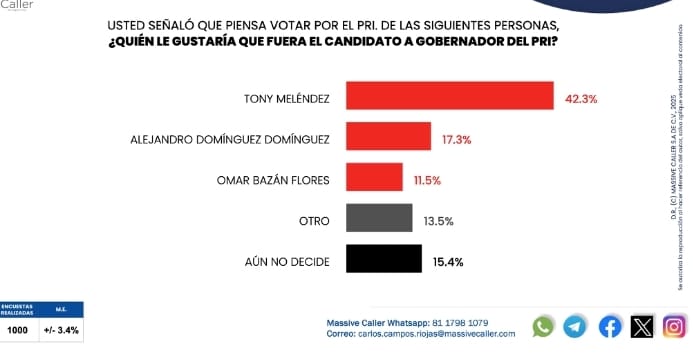 En el PRI encabeza la encuesta Tony Meléndez con un 42.3 por ciento seguido de Alejandro Domínguez con un 17.3 por ciento y Omar Bazán con un 11.5 por ciento.