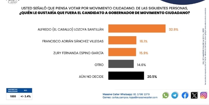 Por Movimiento Ciudadano Alfredo Lozoya tiene un 32.9 por ciento de las simpatías, mientras que el diptuado Francisco Sánchez, el 16.1 por ciento y Zury Espino el 15.9.