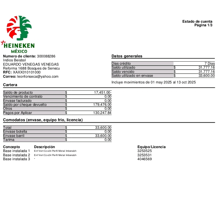 Por lo pronto, aquí anexamos una de las facturas por la compra de cerveza por un monto de 851 mil pesos a la empresa Cuauhtémoc Moctezuma, a nombre de Eduardo Venegas Venegas, encargado de la logística de los indios al momento de esa compraventa que les generó cuantiosas ganancias. También un estado de cuenta realizado por Heineken por 33 mil 600 pesos por la compra de cerveza de barril del 1 de mayo al 13 de octubre.