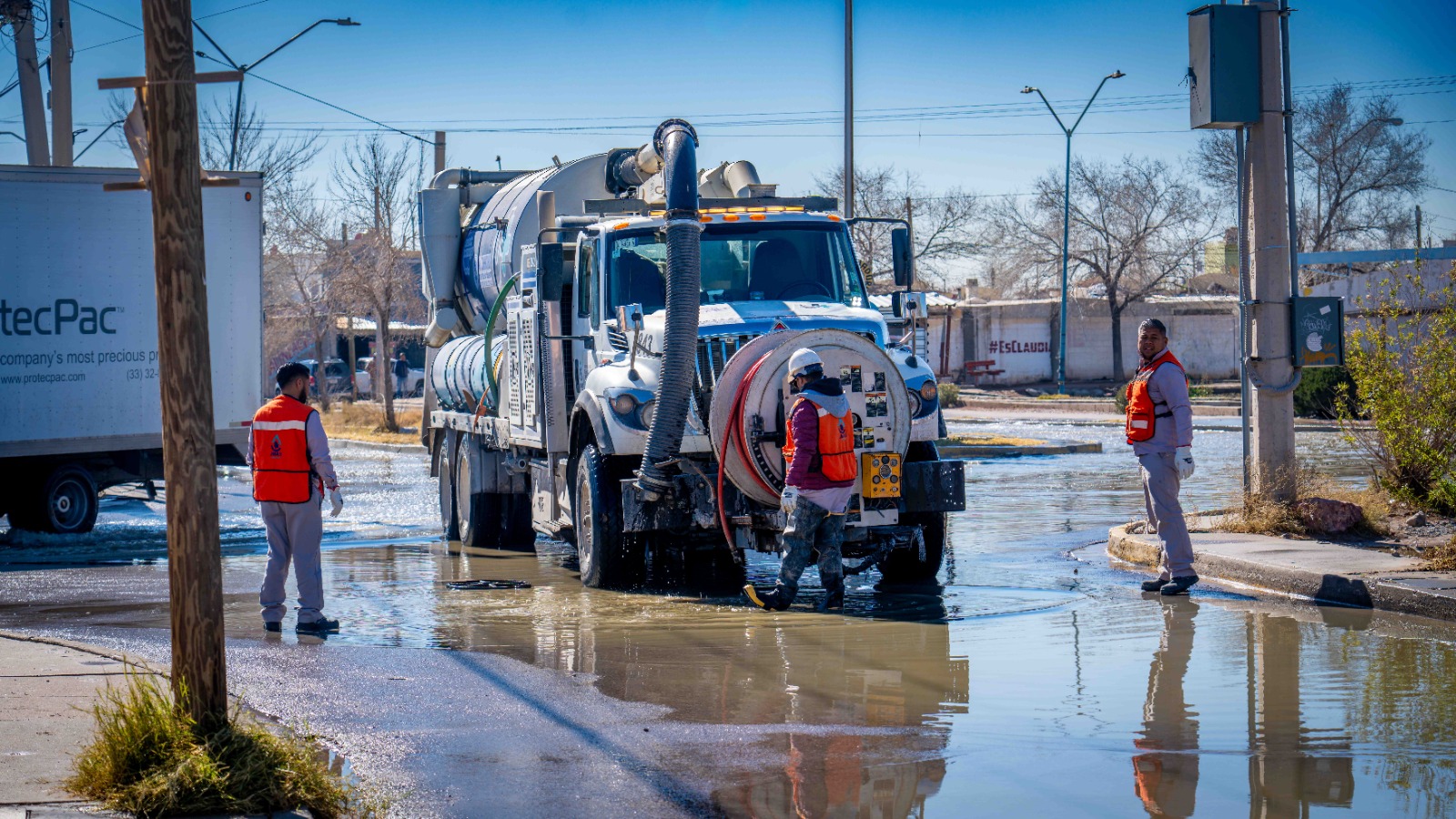La Junta de Agua y Saneamiento de Juárez, realizó trabajos de mantenimiento en la red sanitaria del fraccionamiento Villa Residencial del Real, utilizando equipos especiales de inyección y succión tipo vactor.