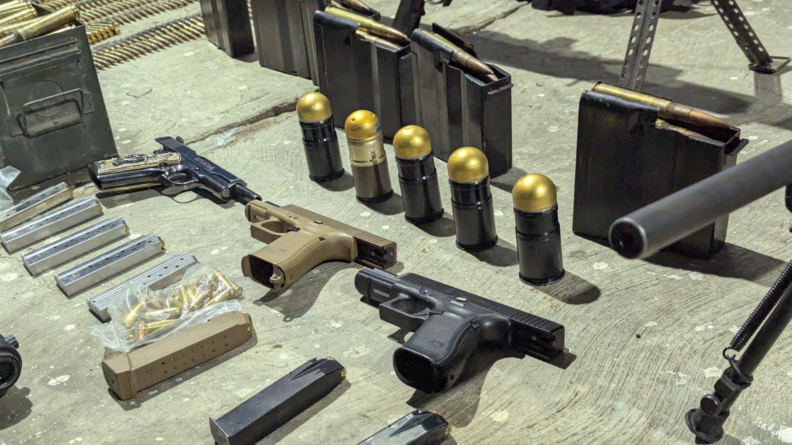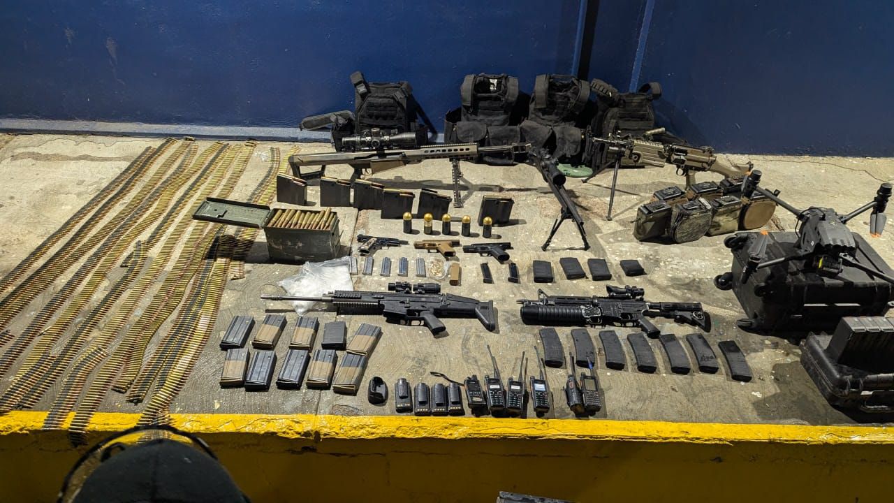 Asimismo, los sujetos portaban cuatro granadas, un dron con seis baterías, cuatro piezas de equipo táctico con placas balísticas, radios de comunicación, 186 dosis de presunta cocaína y un total de un millón 100 mil pesos en efectivo.