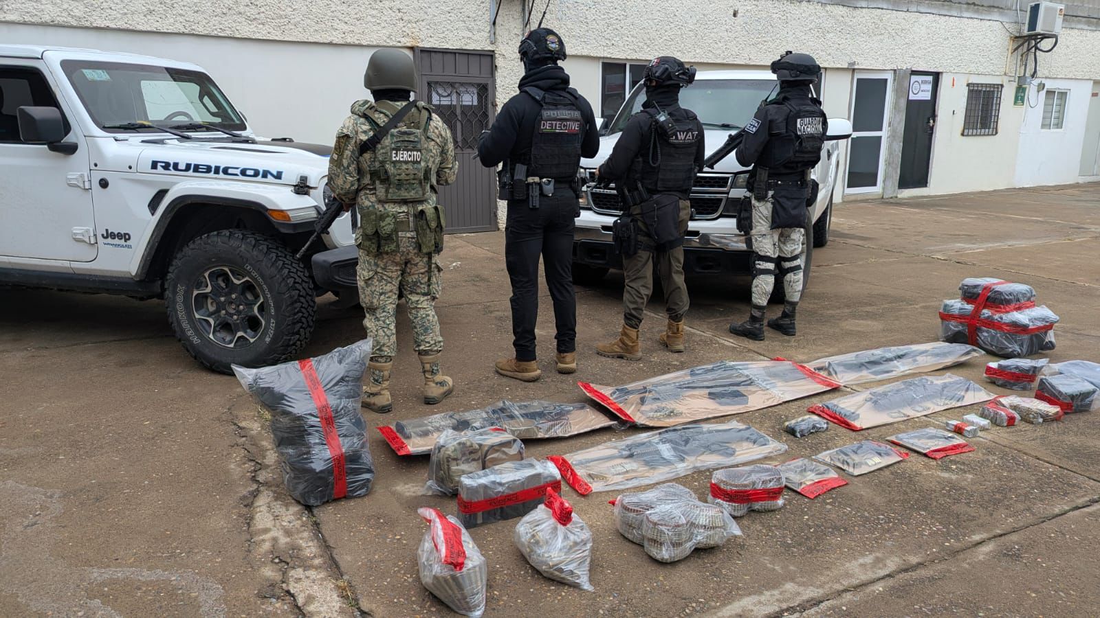 Los hechos ocurrieron durante la tarde del pasado sábado en la colonia Obrera, cuando personal de la Policía del Estado, Guardia Nacional y Ejército Mexicano realizaban labores de inteligencia y rastreo, localizando a cuatro presuntos integrantes del grupo delictivo que se desplazaban en dos vehículos: un Jeep Rubicón con placas sobrepuestas y una camioneta Chevrolet Silverado con blindaje, ambos de color blanco.
