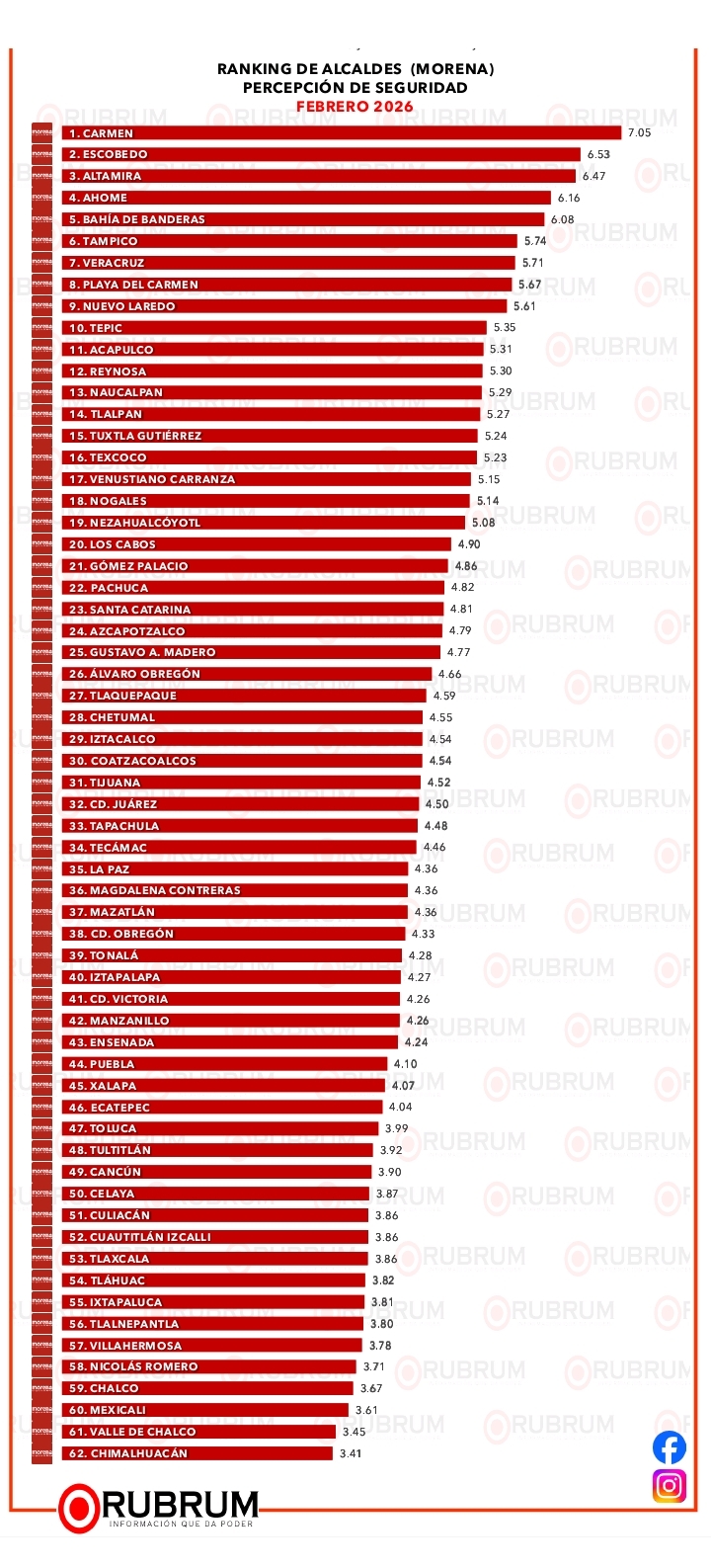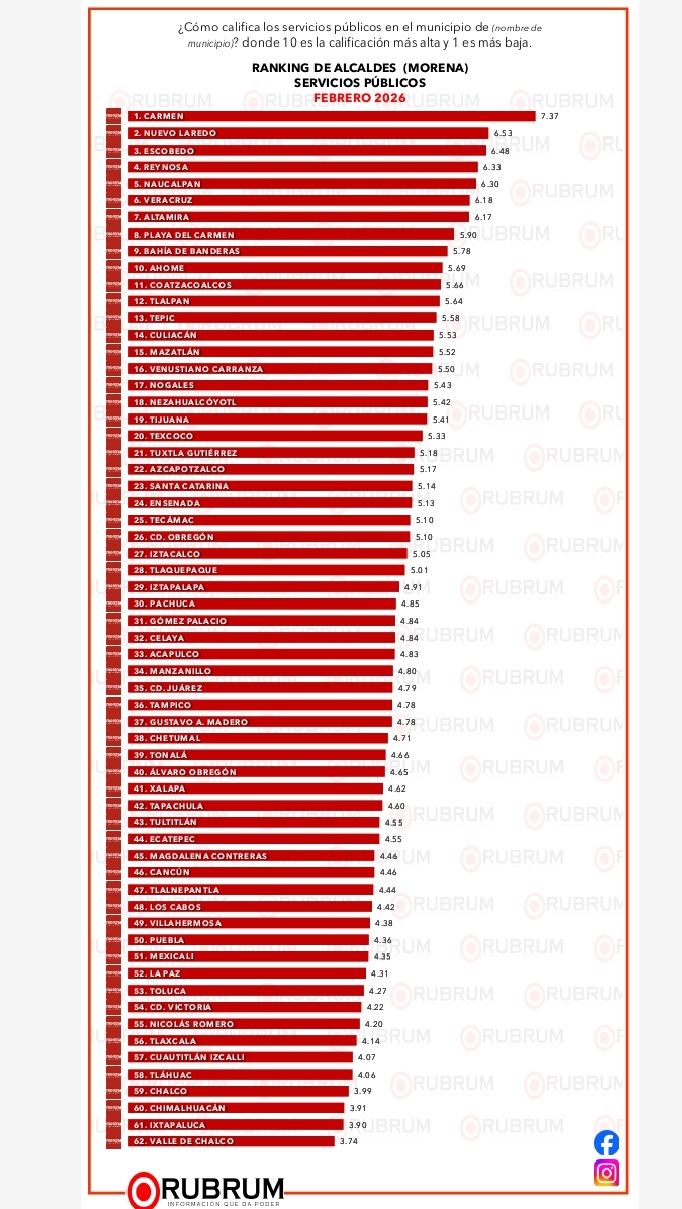 La medición de RUBRUM evalúa desempeño, servicios, cercanía y seguridad mediante encuestas telefónicas a población general, lo que permite comparar directamente a los alcaldes bajo los mismos criterios.