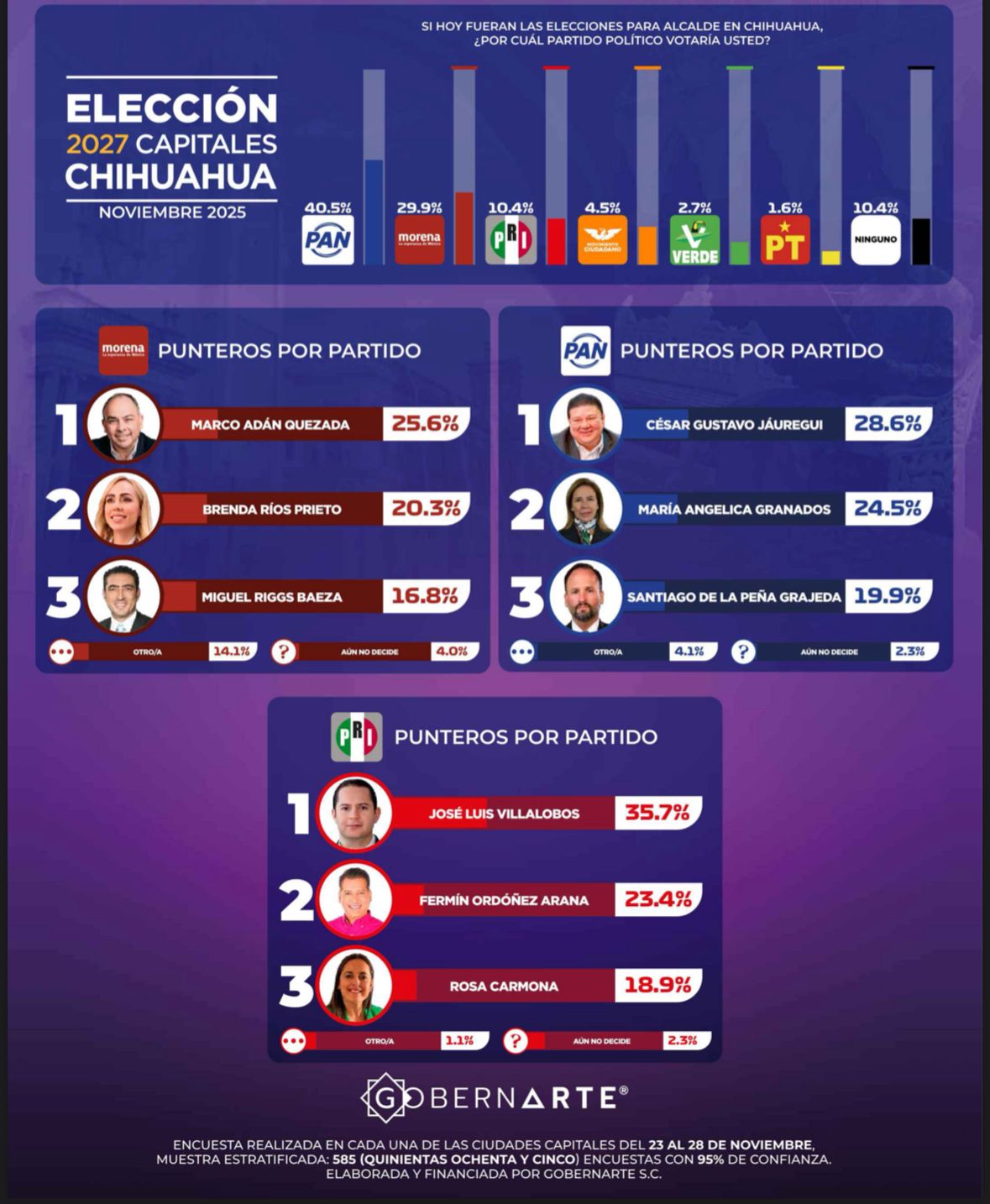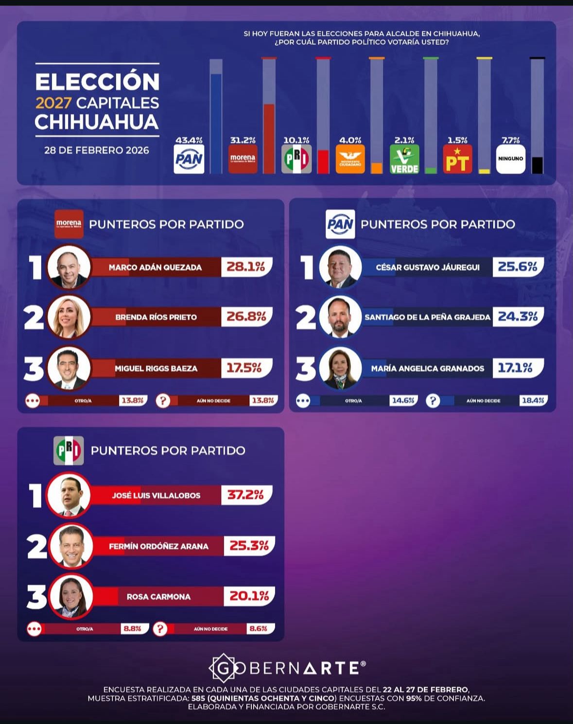 La encuesta de gobernarte fue actualizada del 22 al 27 de febrero tomando una muestra estratificada con 585 entrevistas, con un 95 por ciento de confianza.