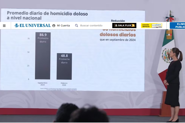 «La reducción en homicidios de septiembre de 2024 a febrero de 2026 es del 44%. Es una reducción continua mes con mes, y febrero es el mes más bajo de por lo menos en 10 años.