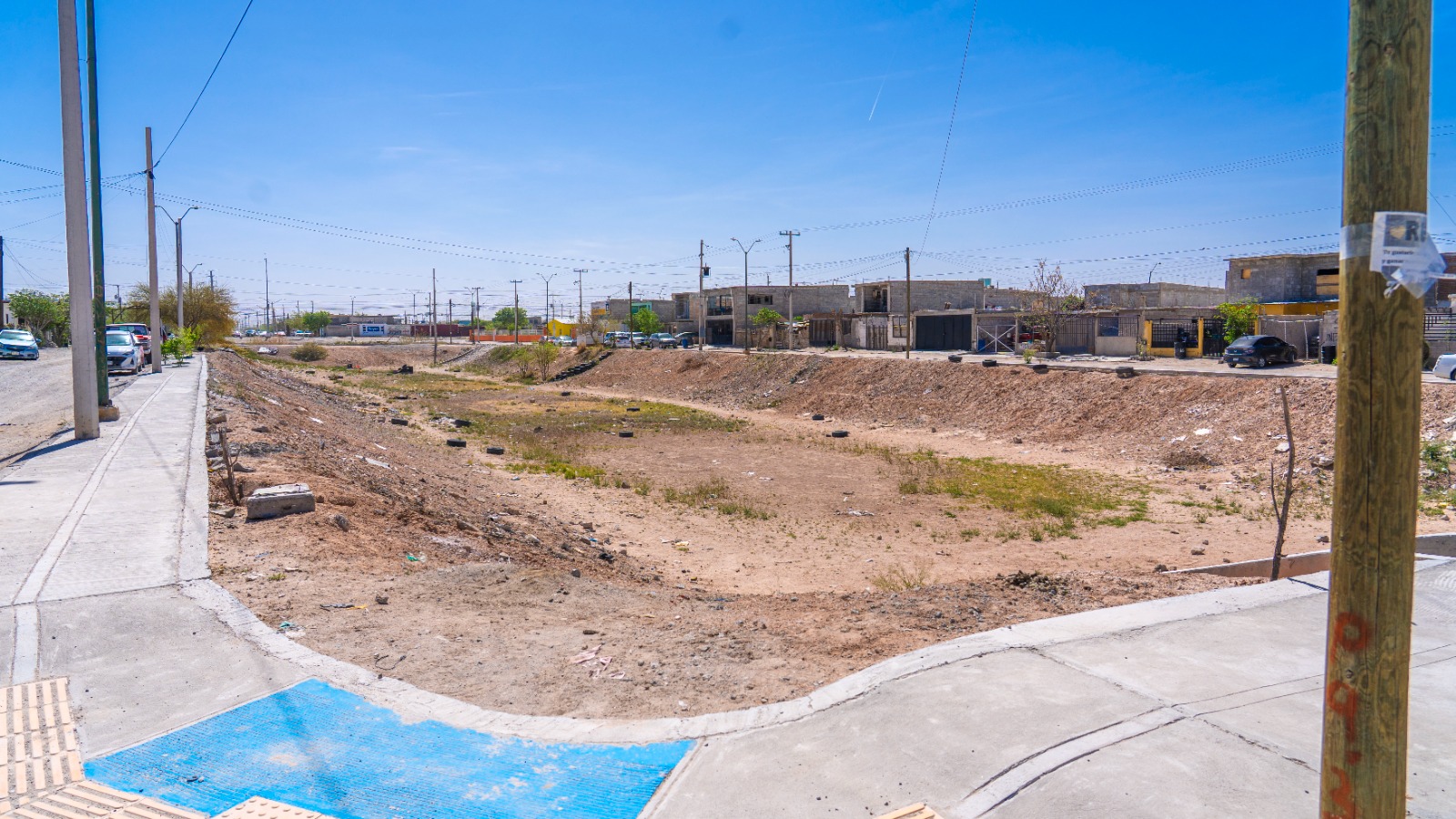 Atendiendo las peticiones de los vecinos del Mezquital, la Junta de Agua y Saneamiento de Juárez, realiza acciones de limpieza del dique ubicado en el cruce de las calles Soja y Aira.