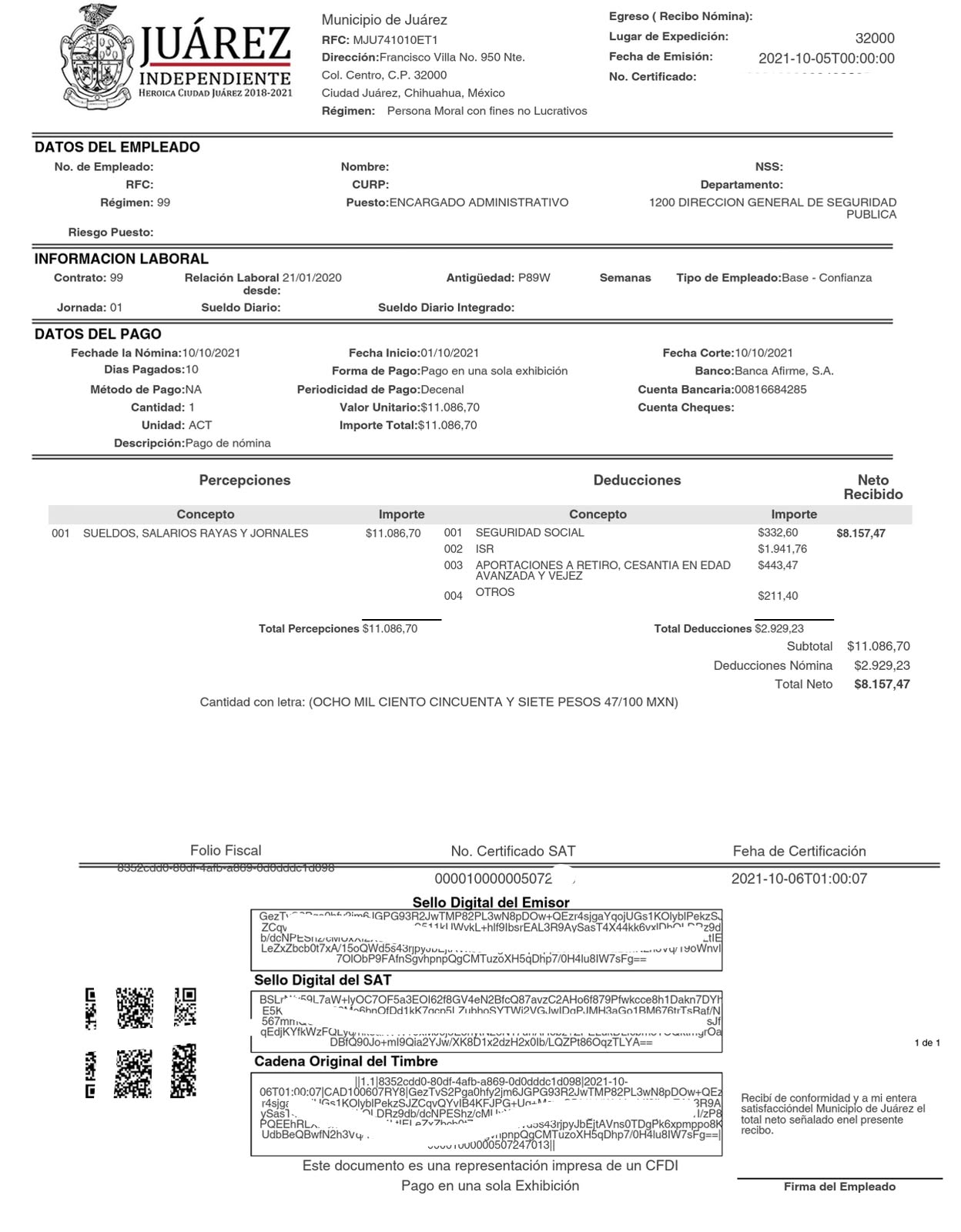 Señaló que la versión del Municipio es falsa: los empleados si pagaron el ISR, pues existen recibos de nómina de 2021 donde aparece el descuento quincenal del ISR a trabajadores municipales. Es decir, el dinero se descontó, pero nunca llegó al SAT.
